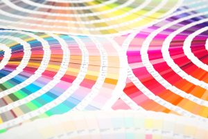 扇状に広げた沢山のカラーチャート。彩り、カラフル、デザイン、コーディネイト、イメージ